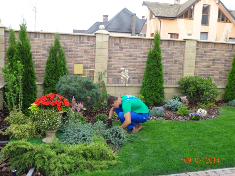 У послугу «Комплексний догляд за садом» входить: - Догляд за газоном: стрижка, аерація,скарификація, мульчування, прополювання (уручну або гербіцидами), добрива. - Догляд за деревами та кущами: обрізка, топиарна стрижка, побілка. - Догляд за квітниками: прополювання, підживлення, підсипка (кори, мульчи, гальки) - Діагностика шкідникив та хвороб: профілактична обробка пестицидами та фунгіцидами . - Догляд за водяними спорудами: чистка водойми,фільтрів, підготовка до сезону. - Очищення від бур*янів доріжок і майданчиків. - Оформлення контейнерів з однорічними рослинами. - Прибирання листя та снігу у осінне-зимовий период. - Вивезення рослинного смиття . - Обслуговування автоматичних систем поливу. - Підготовка рослин до зими: підв’язка, покриття.